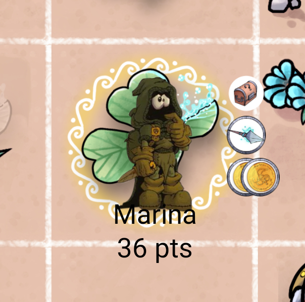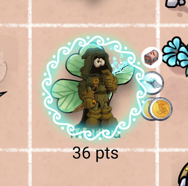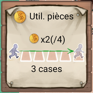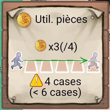 Informations relatives à l'utilisation de pièces. S'affiche lors de la sélection d'une case en phase d'action, lorsque l'action "pièces" est sélectionnée. Indique en première ligne le nombre de pièces qu'avancer sur la case sélectionnée consommerait (et le nombre de pièces total détenues) Indique en seconde ligne le nombre de cases dont avancerait le joueur. Dans le cas où l'avancée réelle serait moins importante que l'avancée maximale théorique (à cause d'un obstacle se trouvant sur le chemin), une icône "attention" s'affiche et l'avancée maximale théorique est rappelée entre parenthèses. |