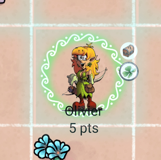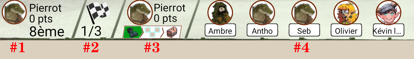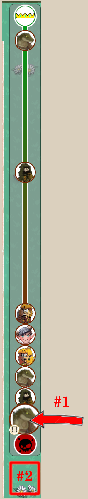 Le joueur qui est actuellement en train de jouer est représenté avec une icône dé (voir flèche (#1)) et le personnage