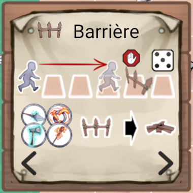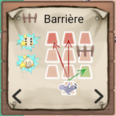 Informations relatives aux obstacles barrières. S'affiche lors d'un clic sur un obstacle de ce type sur le plateau de jeu. Rappelle sous forme schématique les règles de ce type d'obstacle. Cliquer sur les flèches noires droite et gauche pour passer d'une page à l'autre. |
