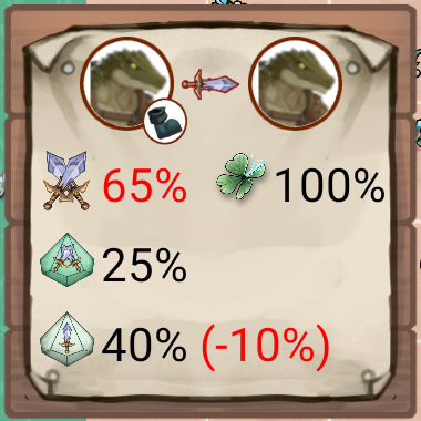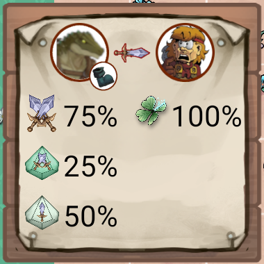 Informations relatives au combat. S'affiche lors de la sélection d'une case de déplacement, dans le cas où la validation du déplacement déclencherait un combat. Les icônes en première ligne indiquent le joueur attaquant (à gauche) et défenseur (à droite). L'icône "botte" indique le joueur se déplaçant et déclenchant le combat. Si une icône "bouclier" est présente sur un joueur, elle signifie que le combat ne sera déclenché que si le joueur en question utilise un bouclier (parce qu'il est sous le coup d'un choc par exemple). Les trois lignes suivantes indiquent respectivement le pourcentage de chances que l'attaquant a de remporter le combat (ainsi que le pourcentage en utilisant un trèfle à trois feuilles et demi), le pourcentage de chances qu'il a de gagner en infligeant un petit choc et le pourcentage de chances qu'il a de gagner en infligeant un gros choc. Enfin, si l'attaquant subit un malus, il est indiqué en rouge. |
