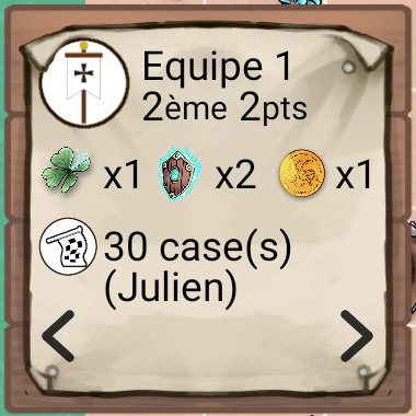 Informations relatives à l'équipe sélectionnée. Indique les informations de l'équipe (nom, classement, score), les objets passifs détenus par l'ensemble des joueurs de l'équipe (et donc utilisables par eux tous) et le nombre de cases restant à parcourir par le joueur le plus avancé de l'équipe avant de terminer le 2ème tour de piste (et donc de déclencher la fin de partie anticipée). Il est possible de passer d'une équipe à l'autre en cliquant sur les flèches noires droite / gauche. |