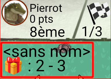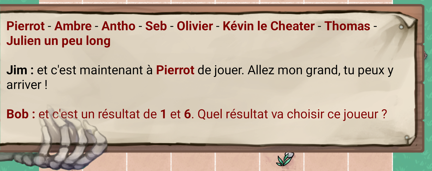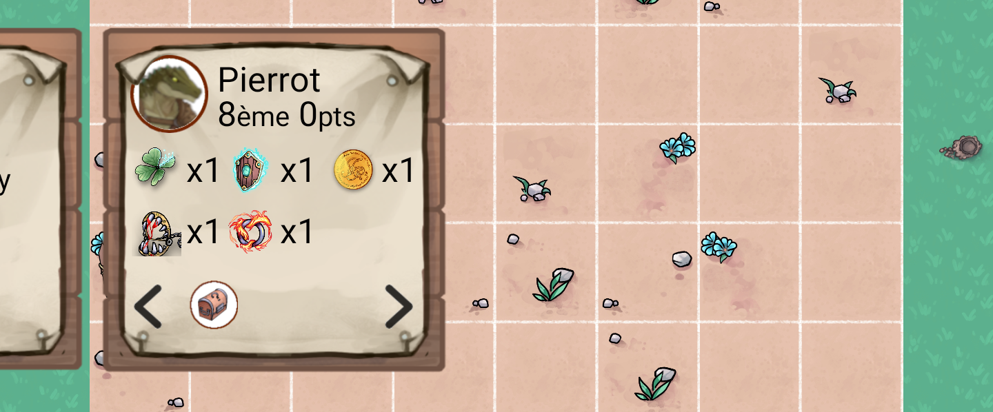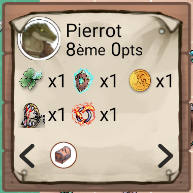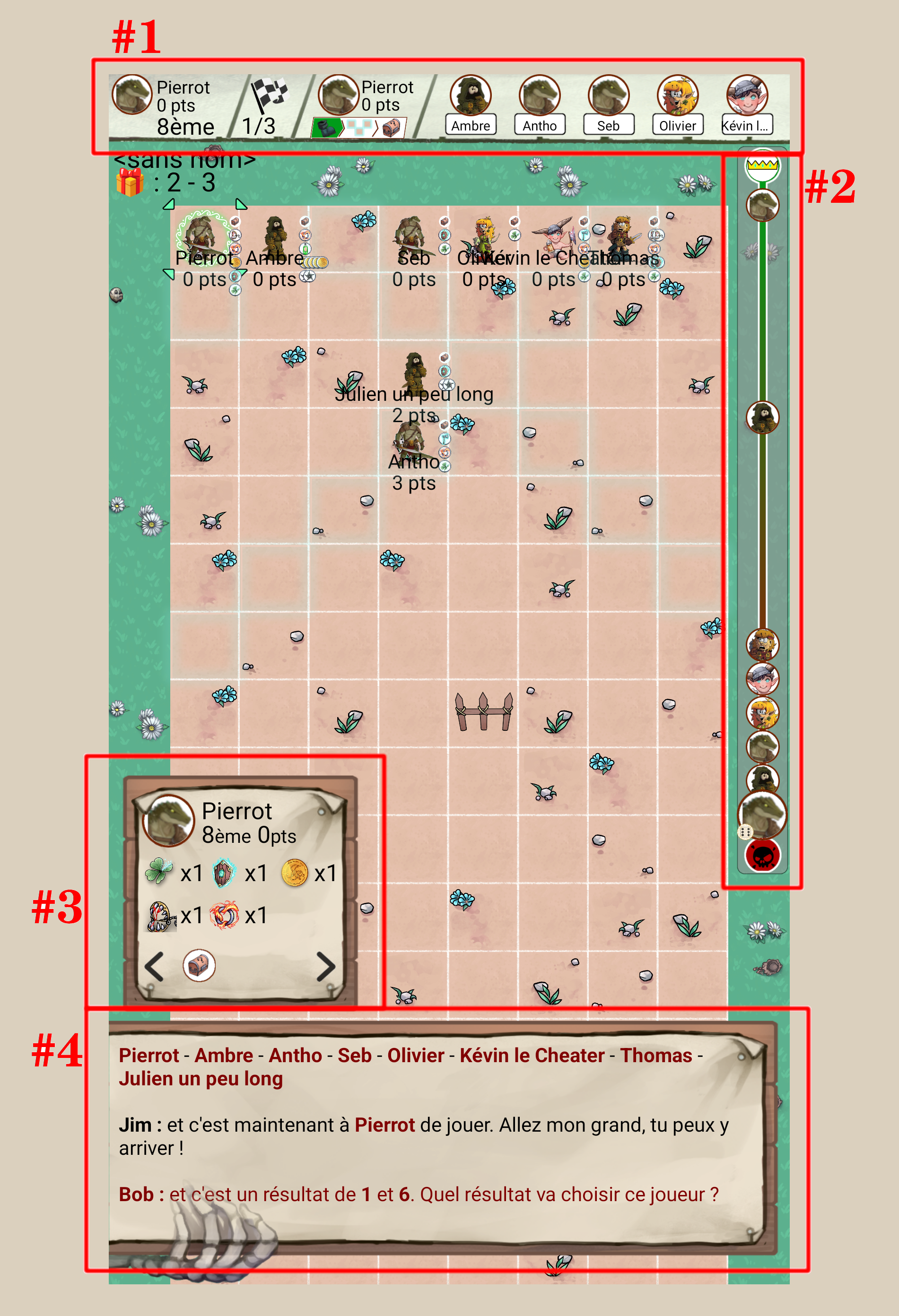 Le parchemin présente les commentaires de Bob & Jim, le duo de commentateurs de la course. Leurs commentaires décrivent la course et expliquent le déroulé de la partie ; en cas de doute ou d'incompréhension sur une phase de jeu, n'hésitez pas à les regarder ! Les commentaires issus de la dernière action de jeu sont écrits en rouge. Le parchemin peut être masqué en réalisant un swipe dessus de la droite vers la gauche (poser le doigt dessus et glisser vers la gauche, puis relacher). Une fois masqué, un clic simple sur le bord restant affiché à gauche de l'écran permet de le réafficher entièrement. Si la fenêtre contextuelle est affichée, elle descend alors pour se positionner au niveau du parchemin (cf deuxième image ci-contre) Cliquer sur la moitié haute du parchemin permet de remonter dans l'historique des commentaires. Cliquer sur la moitié basse permet au contraire de redescendre dans l'historique. Afficher le détail du score d'un joueurIl est possible d'afficher dans le parchemin les détails du score d'un joueur. Pour ce faire :