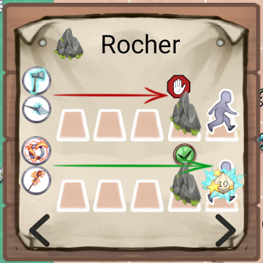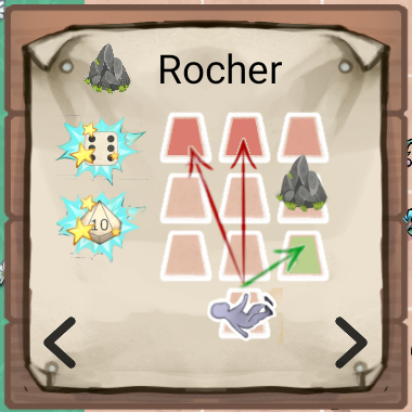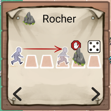 Informations relatives aux obstacles rochers. S'affiche lors d'un clic sur un obstacle de ce type sur le plateau de jeu. Rappelle sous forme schématique les règles de ce type d'obstacle. Cliquer sur les flèches noires droite et gauche pour passer d'une page à l'autre. |