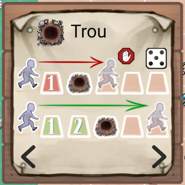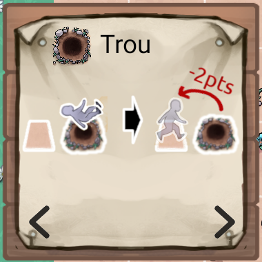 Informations relatives aux obstacles trous. S'affiche lors d'un clic sur un obstacle de ce type sur le plateau de jeu. Rappelle sous forme schématique les règles de ce type d'obstacle. Cliquer sur les flèches noires droite et gauche pour passer d'une page à l'autre. |