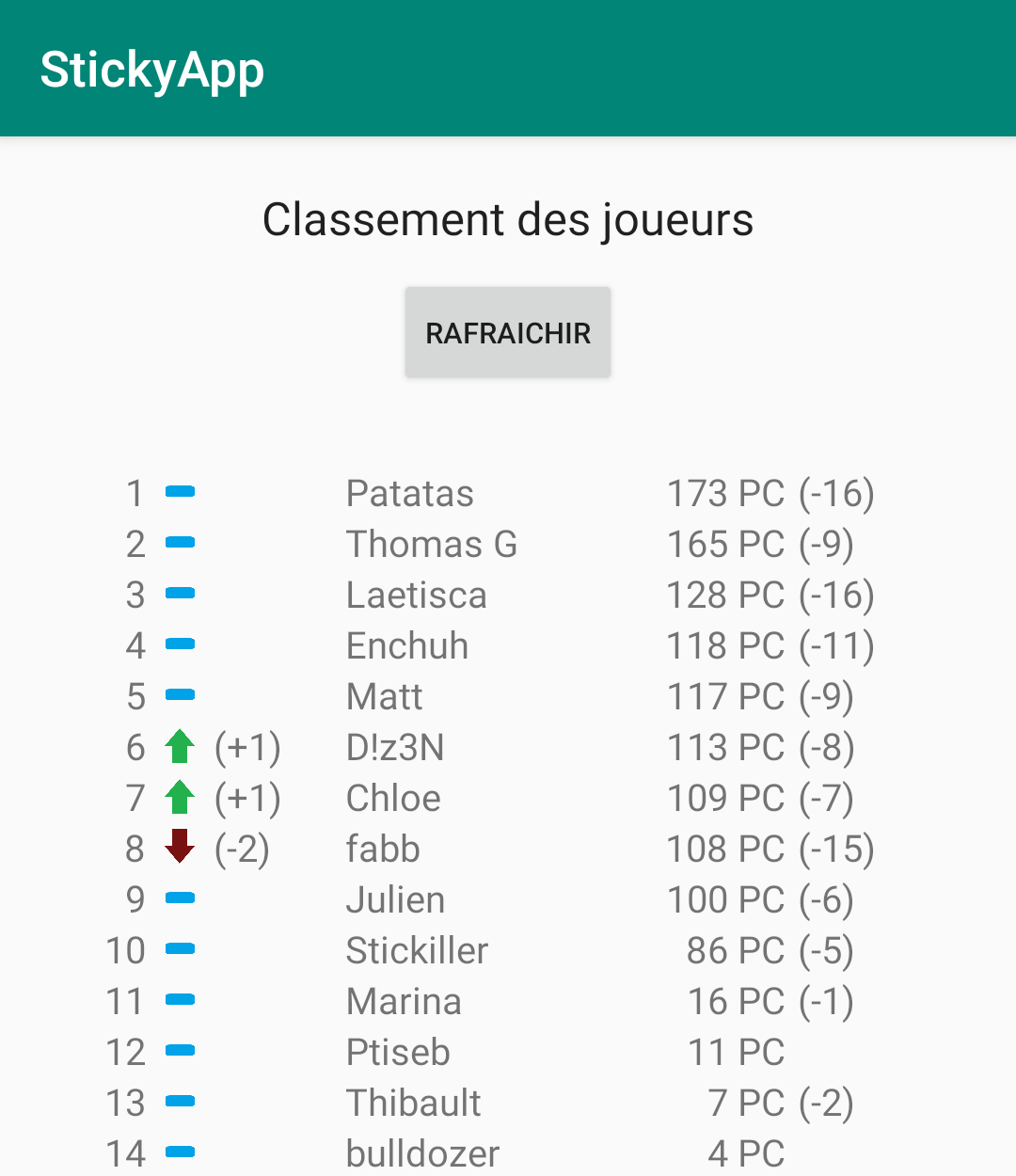 Le nombre entre parenthèse à droite du total de PC de chaque joueur indique la perte (ou le gain) de PC depuis la veille (dans l'exemple ci-dessous tous les joueurs ont perdu