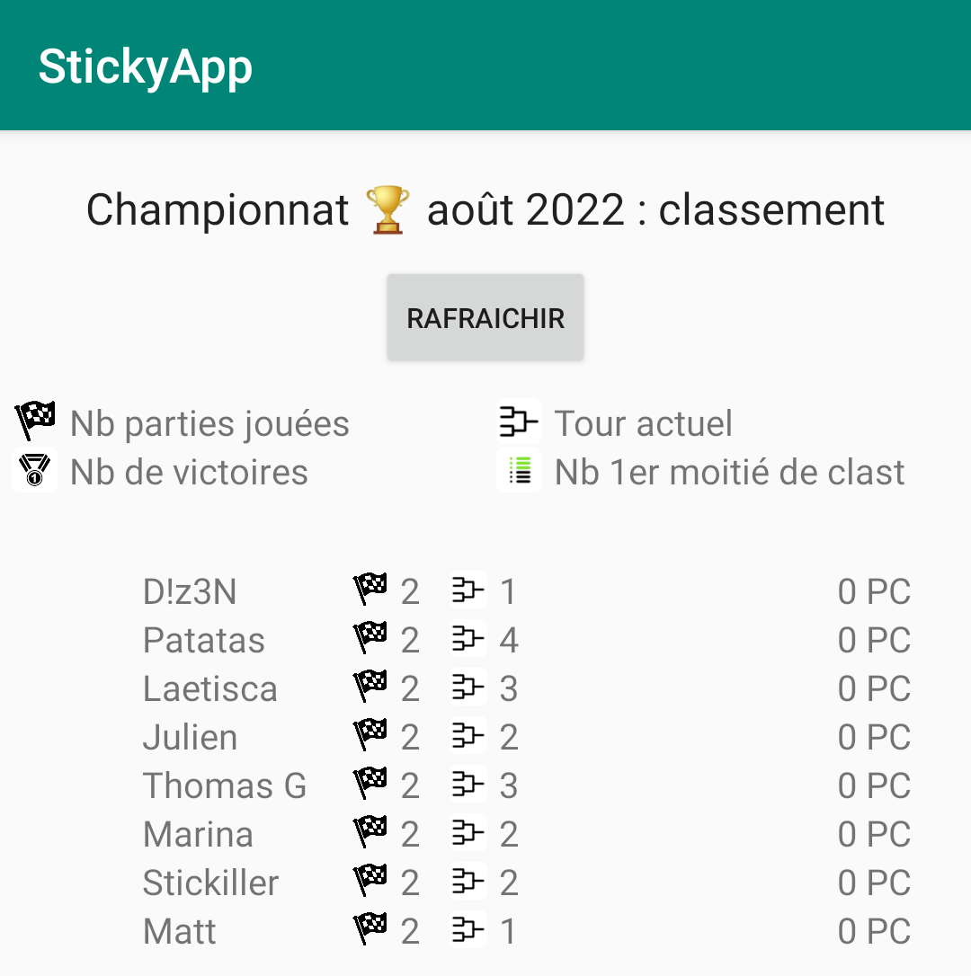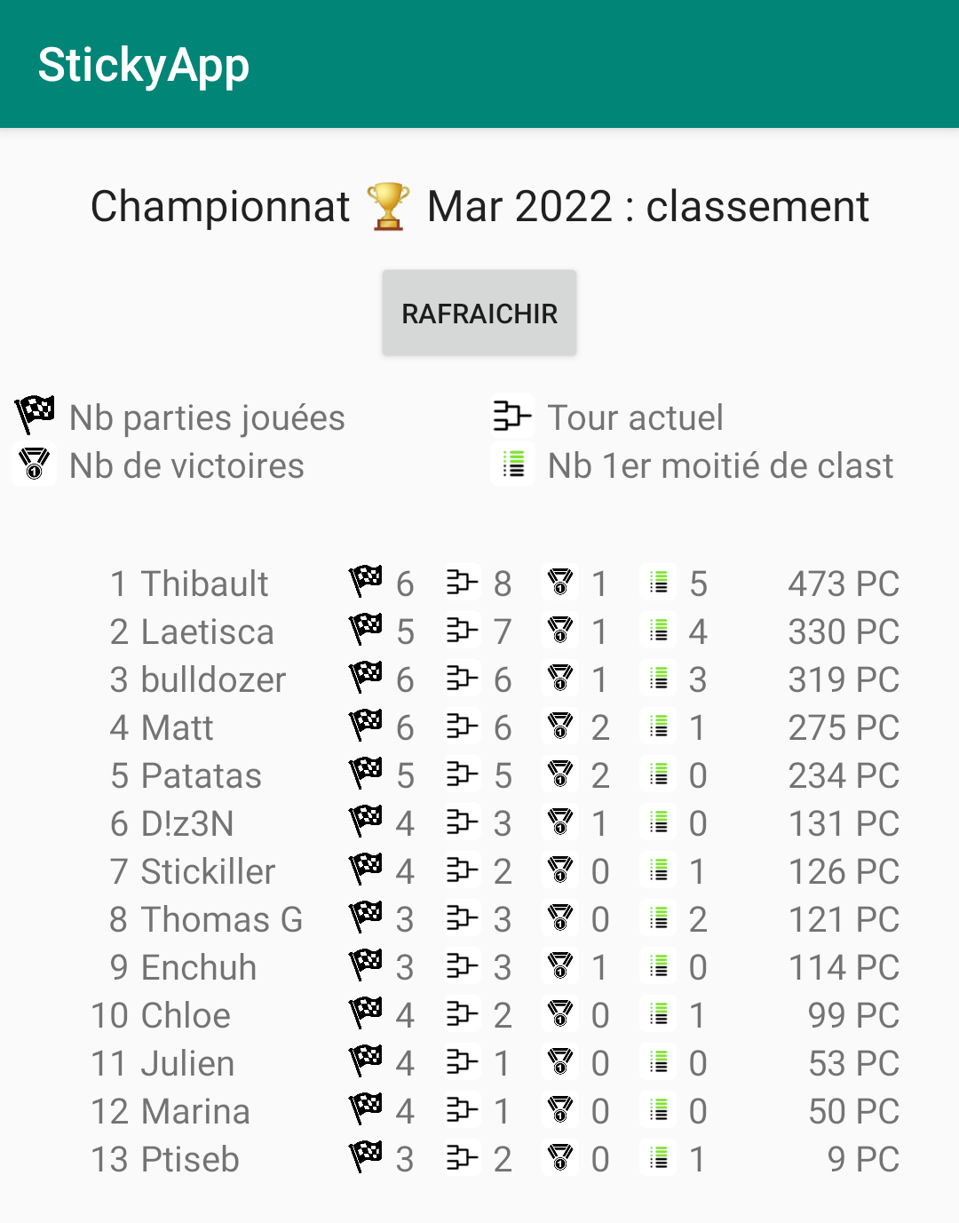 le nombre de parties jouées et le tour actuel de chaque joueur. Dans cet exemple, Patatas semble le mieux parti puisqu'il est au tour 4, suivi par Laetisca et Thomas G au tour 3. |