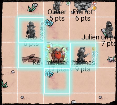 Exemple des 6 cases sur lesquelles le gobelin peut poser un piège : les trois standards au dessus de lui, ainsi que les